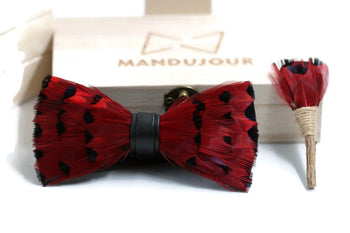 Sold out - Red & Black Polkadot Feather Bow Tie and Lapel Pin Set - Handmade Mandujour Gift for Men