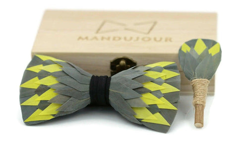 Ignite your style with the Mandujour Fort Worth Electric Feather Bow Tie and Lapel Pin Set.